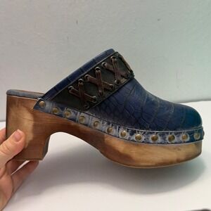 Freebird Woodstock Blue Croc Embossed Leather Wood Platform Clogs 7 Festival