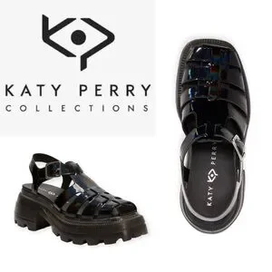 KATY PERRY THE GELI COMBAT BLACK HOLOGRAPHIC FISHERMAN PLATFORM SANDALS **NIB**