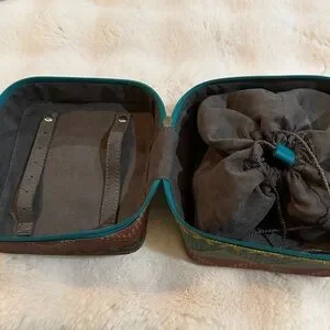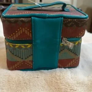 Stylish women Silpada jewelry bag featuring a vibrant pattern with teal accents.Area to hang earrings, necklaces or bracelets. Several inside pockets. Drawstring cord to shut inside area. 7.5 inches wide. 5 inches tall. Zipper closure.