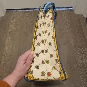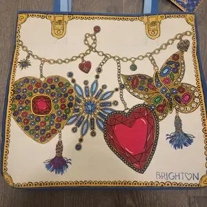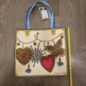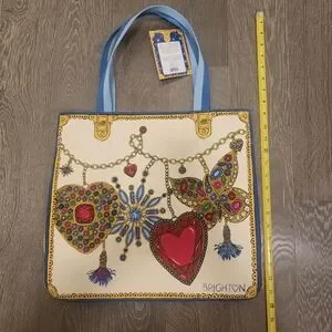 Charming Brighton tote with heart and butterfly designs. Features vibrant colors and intricate patterns. Ideal for a stylish look.
