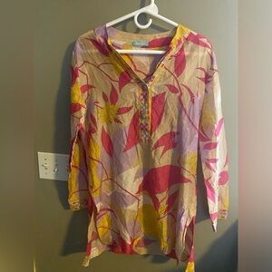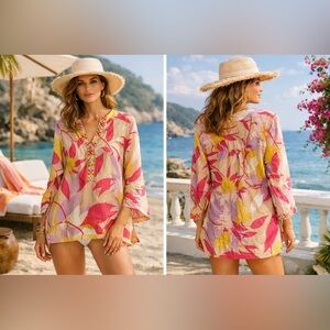 Live in your Emilio Pucci era is this chic printed light weight tunic top. Perfect wait a wide leg trouser or throw it over your bathing suit as a coverup- endless styling options.