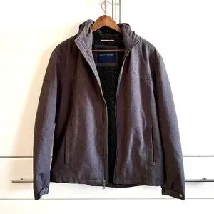 A stylish men's hooded jacket by Tommy Hilfiger, featuring a full zip closure and a cozy interior lining. The jacket is designed for comfort and warmth, making it ideal for cooler weather.