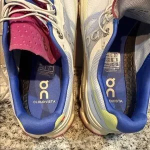 Experience comfort and style with ON Women's Cloudvista Athletic Shoes. Featuring a sleek white design with vibrant pink accents, these shoes are perfect for your active lifestyle.