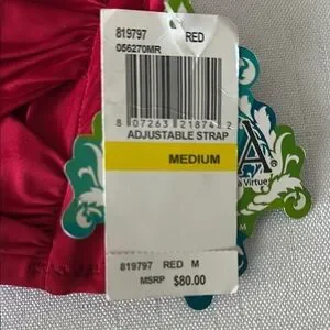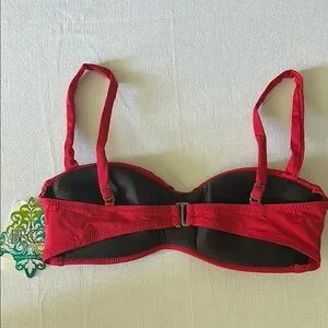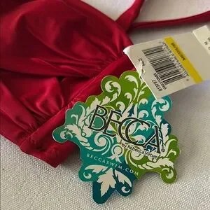 Stylish red bikini top by BECCA. Features a unique front detail. Perfect for beach days.