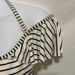 Elegant one piece with cream and black stripes. Features ruffled off-shoulder design. Ideal for beach outings.