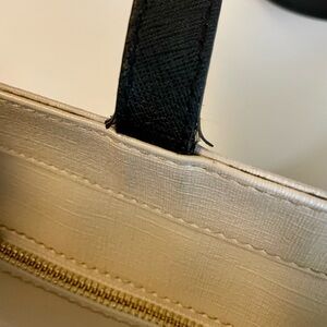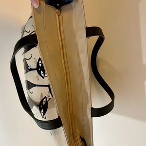 Big zippered tote with fun cat print! Outside is nearly perfect, just the faintest wear on the corners and one bit of wear at the base of one handle (pictured). Storybook lining, though the inside could use cleaning. Large zipper pocket, two slip pockets. 13”x11”x6.5”