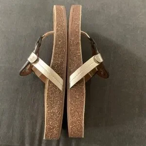 Chic metallic sandals with signature logo design. Comfortable tan footbed. Sticker mark on right sandal by heel part.