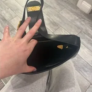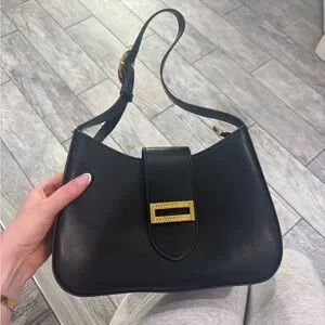 Sleek black leather shoulder bag with a polished gold-tone clasp. Comfortable single shoulder strap for everyday wear. Minimalist design complements both casual and dress looks. Smooth leather finish for a refined appearance.