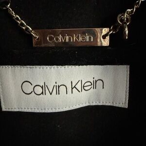 Sleek black trench coat by Calvin Klein. Wrap-front silhouette with a matching self-tie belt. Clean lines and minimal detailing. Subtle notch lapel and long sleeves. Polished, versatile outerwear piece.