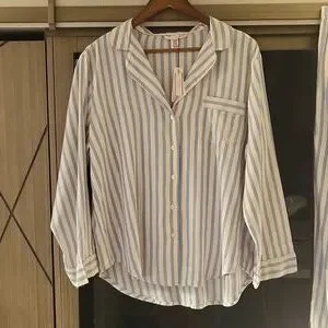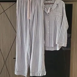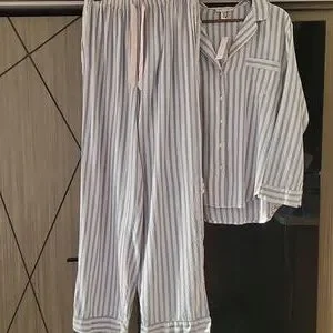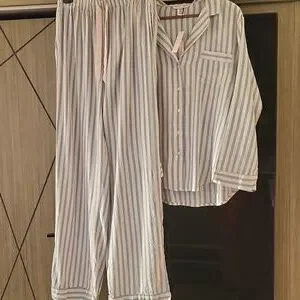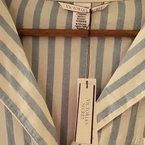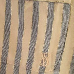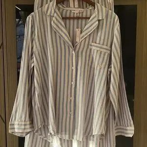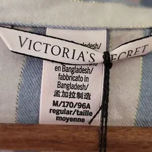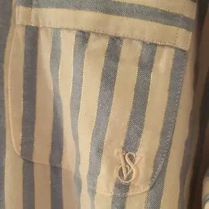 1.) 🥹🫶 ❤️🌻🦋🩷 Modal cotton, 2- piece set! Oh, so very soft to the touch, NWT) size M. modal/cotton), pants snd long sleeve button-up shirt with a pocket and has the, "VS" logo on the pocket shirt, embroidered logo) light blue/ light pink/ and gold stripe set) by "Victorias secret"