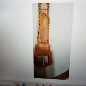 Belt is Tan/Brown, with black, cream, & brown stitching. Enhance your outfit with this stylish leather belt for women. The belt measures 40 inches in length and is designed with a trendy Aztec tapestry pattern that adds an ethnic touch to your look. The belt features a normal width and silver hardware material that complements the brown color of the leather. Incorporating needlepoint design and embroidered accents, this fashion belt is perfect for women who love to express their bohemian spirit. Additionally, the belt comes with an adjustable buckle that allows you to achieve the perfect fit. Get this vintage piece now and elevate your fashion game.