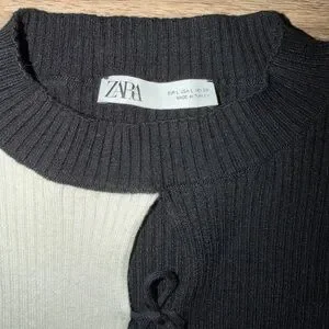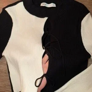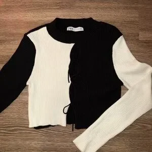 Zara black and white ribbed sweater with a stylish lace-up front. Cropped silhouette with contrasting black and white colorblock panels. Soft knit fabric for everyday comfort and easy layering.