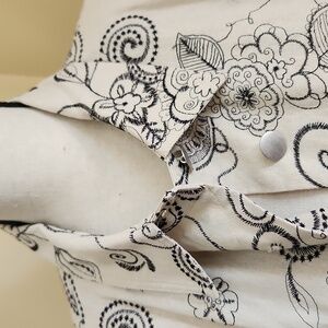 Stylish button-up jacket / shacket with a floral embroidered pattern. From QVC. No paper tags, not worn NWOT. Side pockets stitched shut, not yet opened. Features a classic collar and long sleeves. Fully lined. Perfect for casual or formal occasion.