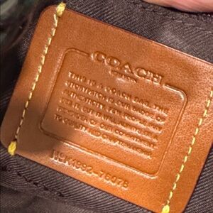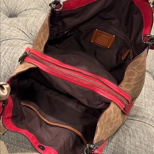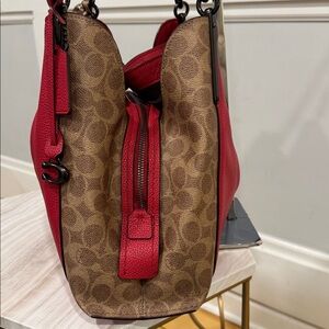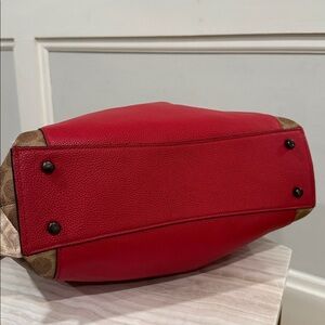 Elegant Coach tote in red leather with brown signature canvas panels. Features durable straps and polish metal hardware. Stylish and versatile for everyday use. Includes a matching Coach zip wallet in brown and red. Comfortable carry and refined Coach design.