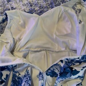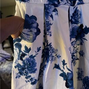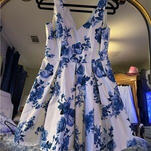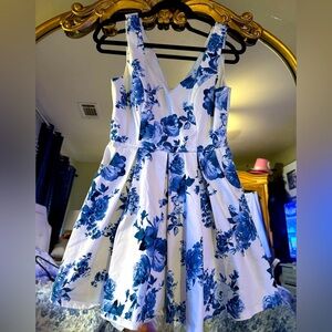 Elegant floral dress featuring a stunning blue and white design. Perfect for any occasion. Lined, padded with pockets . Fits more like a junior size . Please see measurements in pictures.