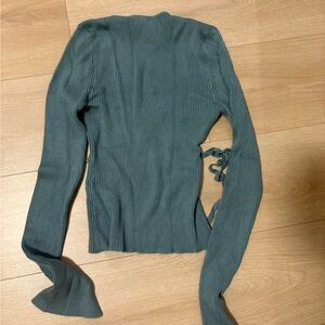 Ribbed long sleeve top with front tie detail. Deep V neckline and fitted silhouette. Soft stretch knit in a muted teal green shade. Easy to style for layering or standalone wear.