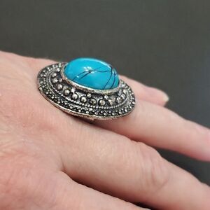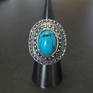 Pretty silver colored oval shaped adjustable ring has a blue faux stone.