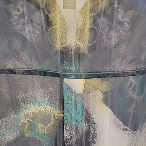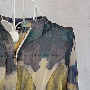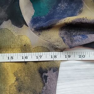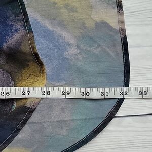 Deep colors of purples and bronze in a watercolor print blouse by Mossimo with long sleeves, a v-neckline with a hidden zipper placket, and a long silhouette in a hi-lo style. Good pre-owned condition with normal signs of wash and wear, including small thread pulls. See pictures.