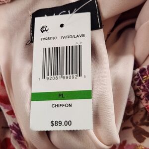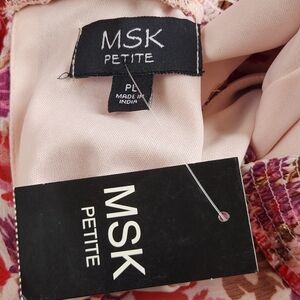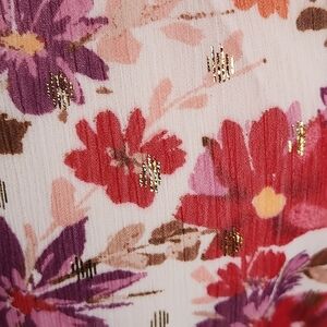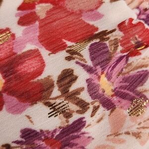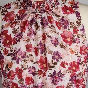 A beautiful field of flowers with a touch of gold decorates this pretty petite midi dress, a charming smocked mock neck design subtly trimmed with ruffles at the hem.