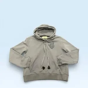 It is a pullover sweatshirt featuring a signature logo patch on the chest, a spacious hood with drawstrings, and practical side pockets