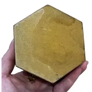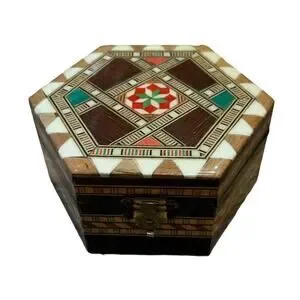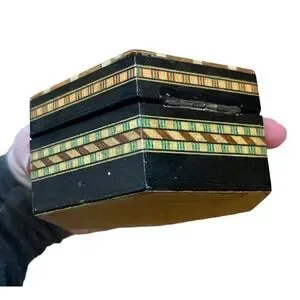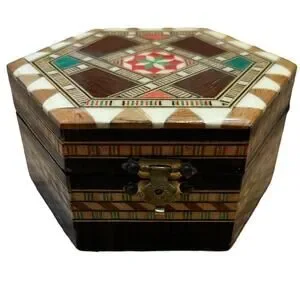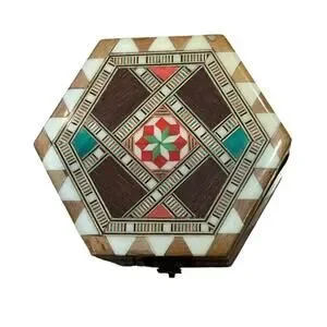 This vintage octagonal box is a beautiful addition to any collection. The intricate inlaid marquetry design is made of glossy wood and features a striking geometric pattern in shades of red, cream and green. The box is ideal for storing jewelry, trinkets, or other small keepsakes. It measures 4 inches in length and has a buckle closure. This unique piece has a 1960s style and is perfect for teenagers, adults, and kids alike. It is in good vintage condition with only minor scuffs here and there, nothing major. Some discoloration to the bottom of box- see photo. Overall very nice for its age. . Add a touch of novelty to your decor with this charming box.