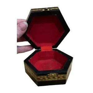 VTG Octagonal Lidded Trinket Jewelry Keepsake Box Red Inside Marquetry Inlaid
