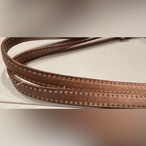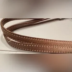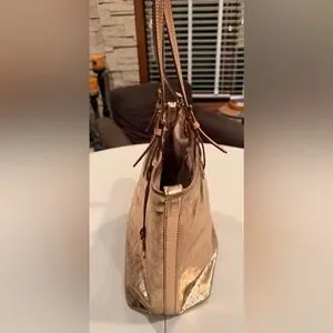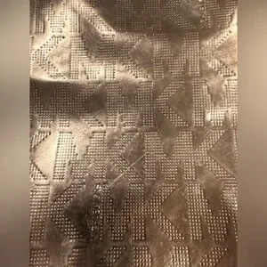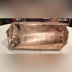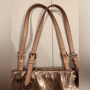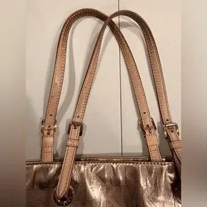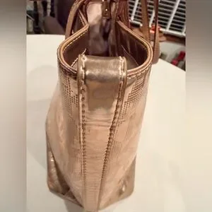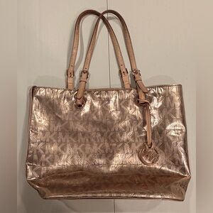 Women’s MK Michael Kors metallic tote bag. MK logo embossed on bag. Adjustable leather shoulder straps (they are slightly darker at tips due to usage). 1- metal gold disc MK hang tag. The bottom has 4- gold metal feet. The interior is full lined in Kors logo fabric with 4- slide in pockets and 1- zippered pocket. Rose gold color. The corners of the bag have some wear. See pics. The interior is clean. Good, used condition.