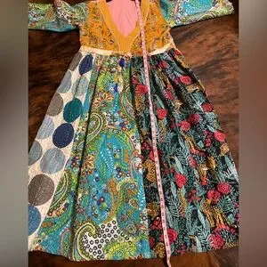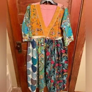 vibrant bohemian dress featuring mixed prints and a deep V-neck. Mustard and teal tones create a bold, colorful look. Soft, flowing fabric with an easy, relaxed fit. Perfect for casual outings or layered styling. No tag I’m a medium and it fits me