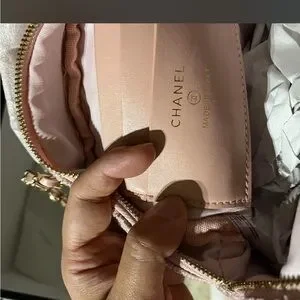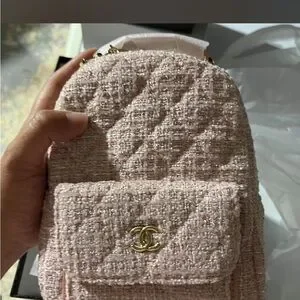 Chanel backpack in pink tweed. Features iconic logo and quilted texture. Stylish and luxurious.