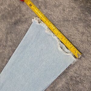 Chic wide leg jeans. Sky blue wash. Raw hem adds edge. Ideal for everyday style.
