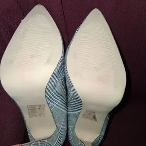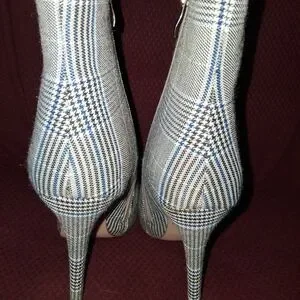 Elevate your style with these elegant plaid heeled boots. 4 inches tall. Worn once. The gray pattern adds sophistication to any outfit.