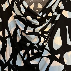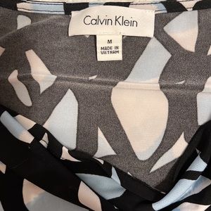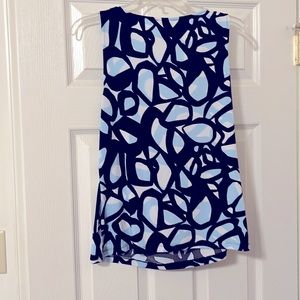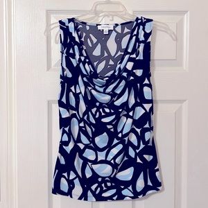 Calvin Klein blouse, size M, blue, black and white print, sleeveless, EUC, pit to pit 19 inches, length 23 inches