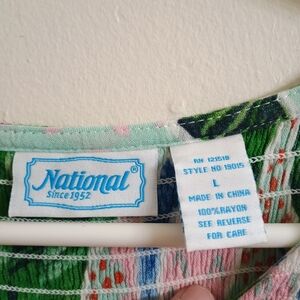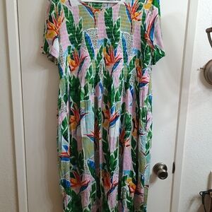 Embrace the vibrant spirit of summer with this stunning sundress, featuring a bold tropical print in green and pink. Designed with a crew neck and short sleeves, this maxi dress offers a relaxed fit perfect for casual or resort wear. Its flowing silhouette and airy fabric ensure comfort and style in warm weather.