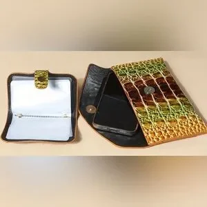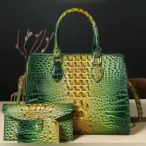 This stylish handbag set features a striking green and yellow crocodile pattern. Perfect for adding a touch of elegance to any outfit. Comes with satchel, wallet, and small pouch.