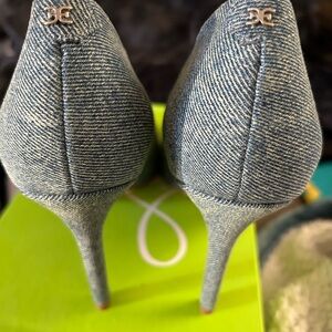 Chic Sam Edelman pointed-toe stilettos in denim. Decorative beaded buckle detail on the vamp. Sleek high-heel profile for dressy looks.