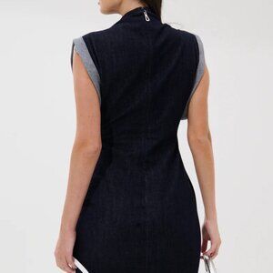 The AKIRA Label All About It Lace Up Mini Dress In Denim redefines modern fashion. This fitted mini features a high neck, cap sleeves, and a sculpted silhouette crafted from dark-wash denim. Bold cont