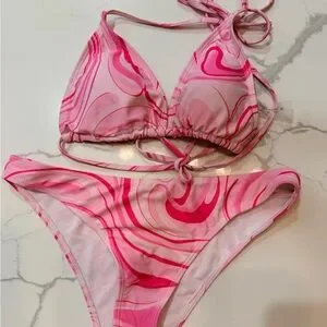 Vibrant floral bikini set with red and pink flowers. Perfect for a stylish beach day. All 4 sets together- one additional top. One is an underwire. Medium