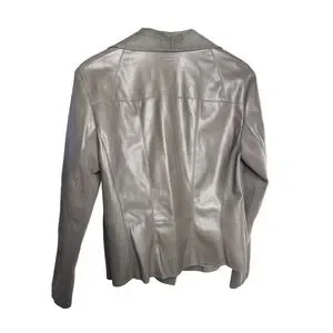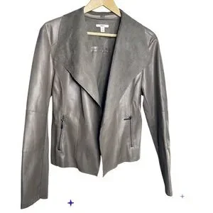 Chic Bar III faux leather draped moto jacket in a beautiful taupe/stone shade. This modern open-front style features a soft draped collar and sleek zipper pockets, giving it a polished yet effortless look. Perfect for layering over jeans, dresses, or workwear for a sophisticated edge.