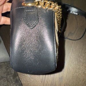 Gucci crossbody showcasing classic GG monogram canvas in beige. Black leather trim and strap frame the silhouette. Gold double-G logo hardware accents the front. Sleek, versatile design for daily use.