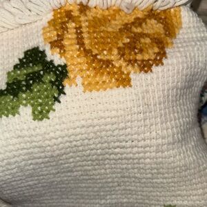 Beautiful doily/cushion cover with yellow floral needlepoint design. Perfect for adding a touch of elegance to any room.