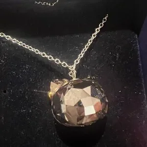 Authentic Swarovski Hello Kitty pendant necklace featuring a beautifully faceted smoky crystal forming Hello Kitty’s face with a gold-tone bow accent. The crystal is cut with Swarovski’s signature faceting, creating beautiful sparkle and depth from every angle.