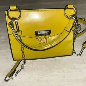 Glossy olive patent mini bag with a top handle. Removable strap for crossbody wear. Front flap with metal SM logo accent. Sleek, structured silhouette for polished looks.