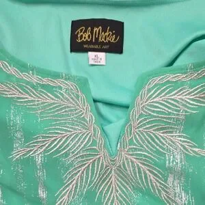 Bob Mackie tunic in mint green. Silver metallic embroidered feather motif at V-neck. Bold wearable-art detailing. Elegant and decorative top.