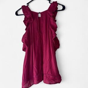 Sleeveless camisole with delicate ruffle trim. Pintuck detailing along the front. Lightweight textured fabric with soft drape. Versatile style for layering or wearing solo.