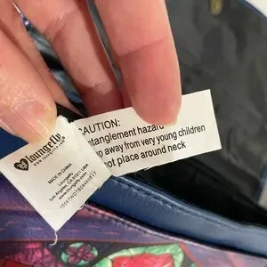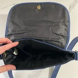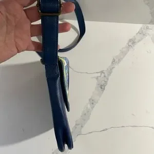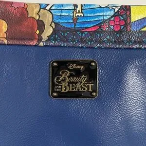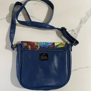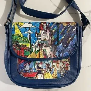 DISNEY Brand. Beauty & The Beast themed Crossbody bag. Navy faux leather with Beauty & The Beast Art. A few faded spots along the edges as shown in photos. Actual Measurements: about 9” x 8” x 3”. Strap is 20” in length & 1” thick.
