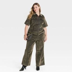 Stylish olive jumpsuit with a corduroy texture. Features short sleeves and a belted waist. Ideal for versatile wear.