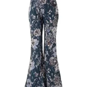 Palazzo, jacquard, floral motif, blue, boho, flared leg cut, high rise waist