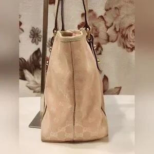 Gucci tote in blush pink GG canvas. Cream leather trim and straps. Center green and pink web stripe detail. Gold-tone hardware and charm. Spacious everyday silhouette.