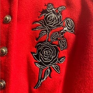 This elegant red jacket features intricate floral embroidery, perfect for adding a touch of sophistication to any outfit. Ideal for both casual and formal occasions.