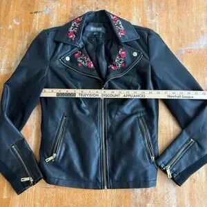 Kenneth Cole Reaction Moto Jacket Womens Small Black Faux Leather Floral Embroid
